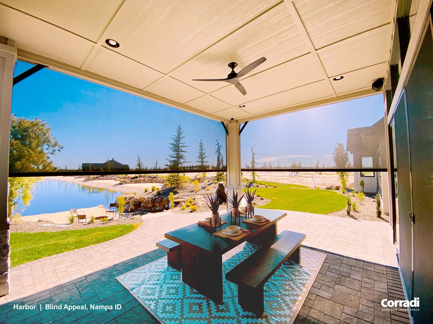 The Harbor is a sophisticated system that encompasses your outdoor space, giving you protection from the sun while allowing you to access gorgeous views without sacrifice. Just like the beautiful lakeside oasis created in Nampa Idaho where the patio is contained by the protection of motorized Harbor screens without surrendering any quality of the gorgeous view.