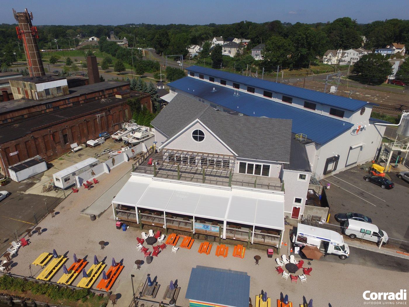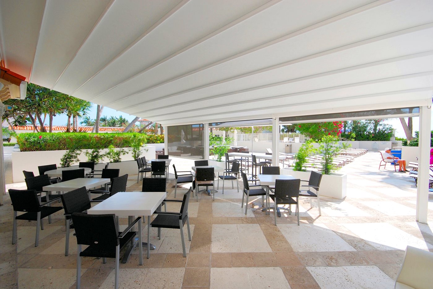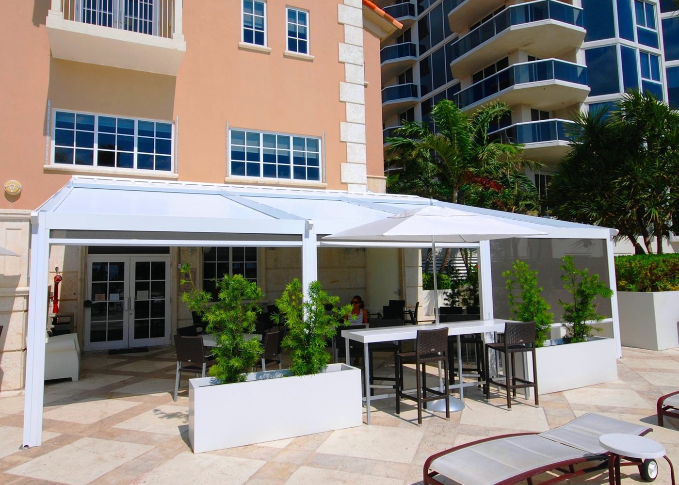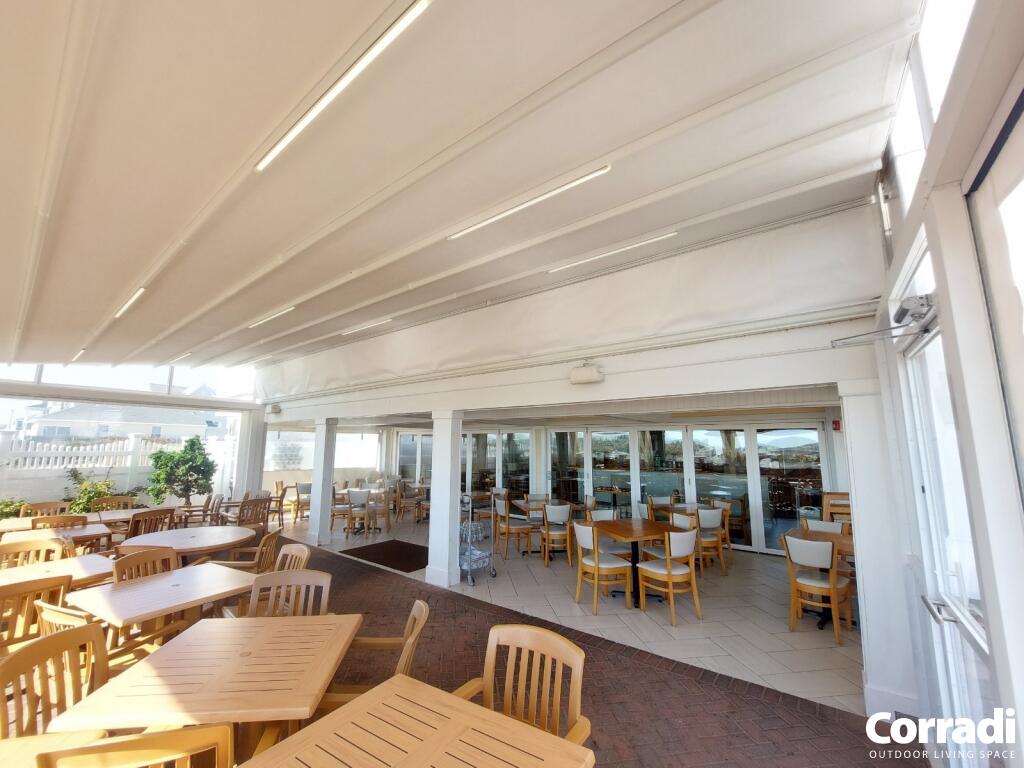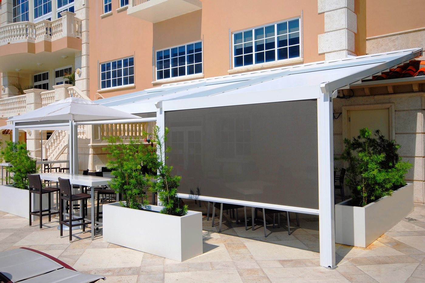 Not limited to residential spaces, the Palladia also thrives in commercial settings. Whether it is wall-mounted or manufactured without pillars, it serves as a durable, retractable pergola solution to enhance all outdoor areas. Embodying technological innovation and modern design, it can be seamlessly integrated to new or existing architecture.
