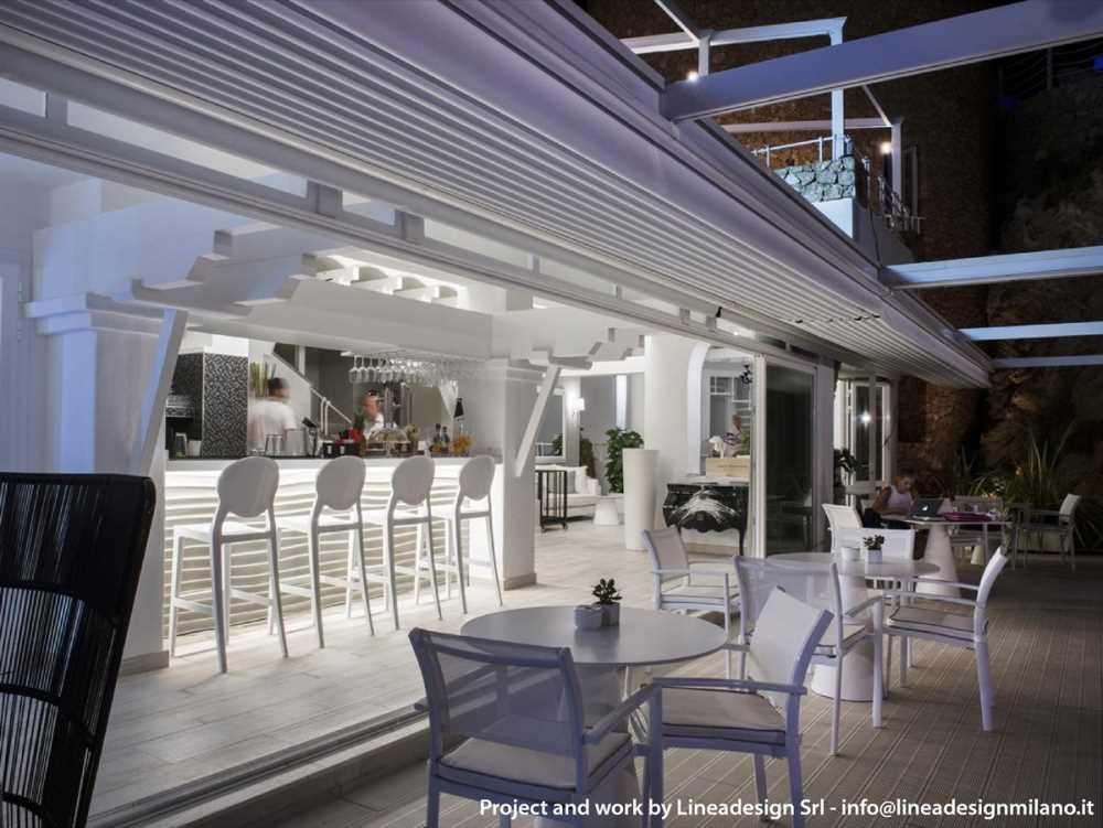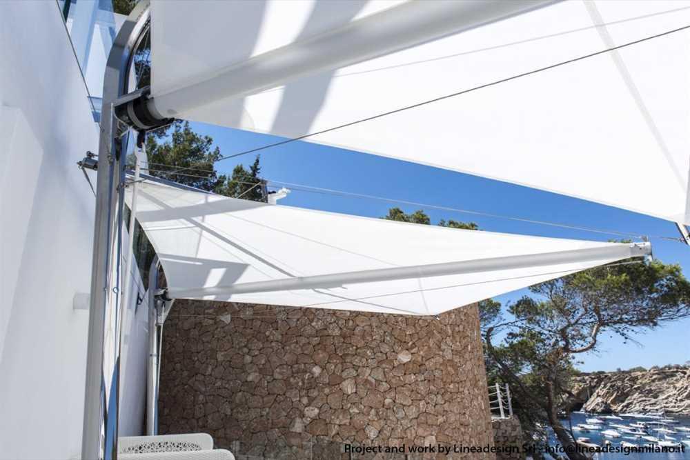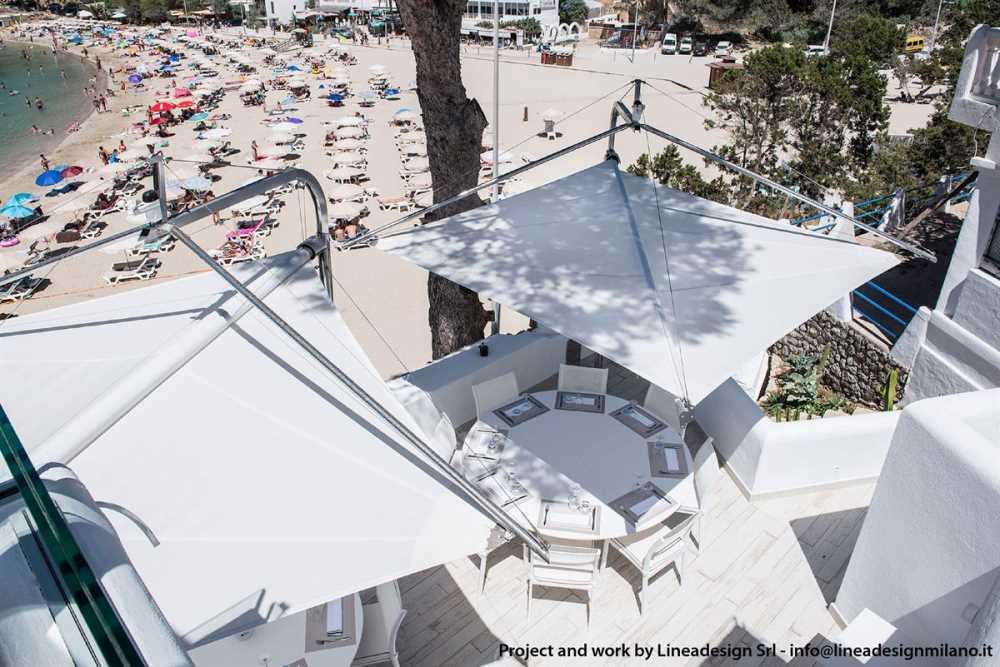 The architecture of the Isla Blanca has as its main feature the ability to blend in perfectly with the surrounding natural environment. The lightness of the Libeccio sails chosen to shade the upper terrace and the essential design of Pergotenda® Palladia at the location's entrance embrace the architecture and amplify the sense of merging with the landscape of one of the most alluring places in Europe.