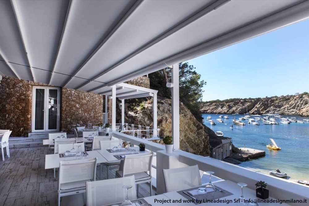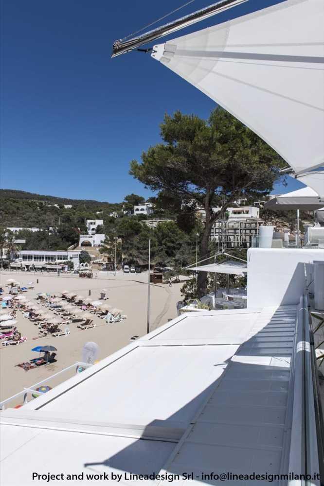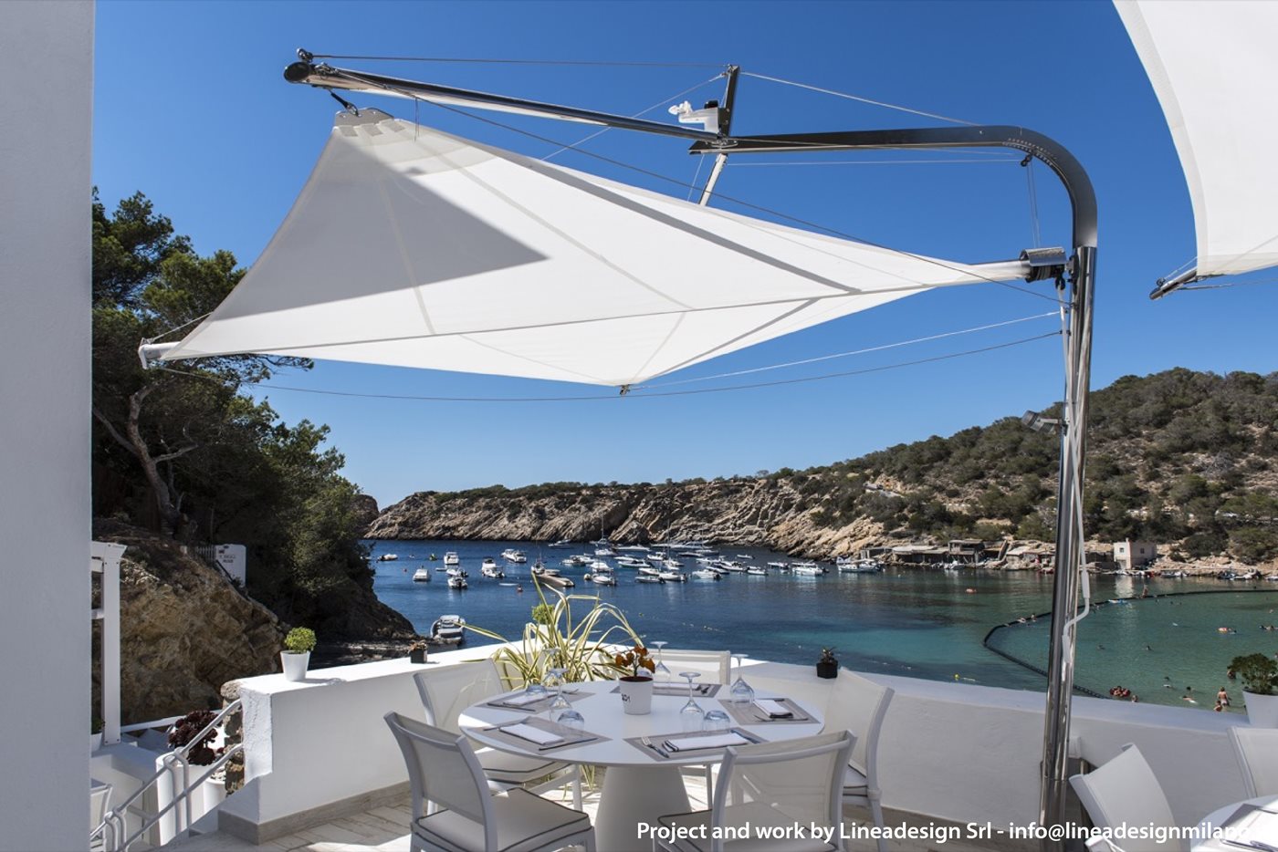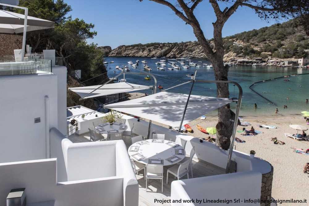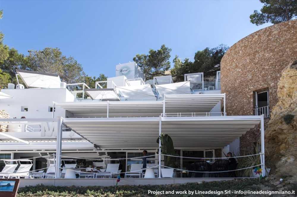 Housed in a typical Mediterranean building made of simple materials and white plaster permeated by a sophisticated mood, the Maya Beach Club has chosen a project by Linea Design to protect its exclusive three-level terrace overlooking the Ibiza sea.