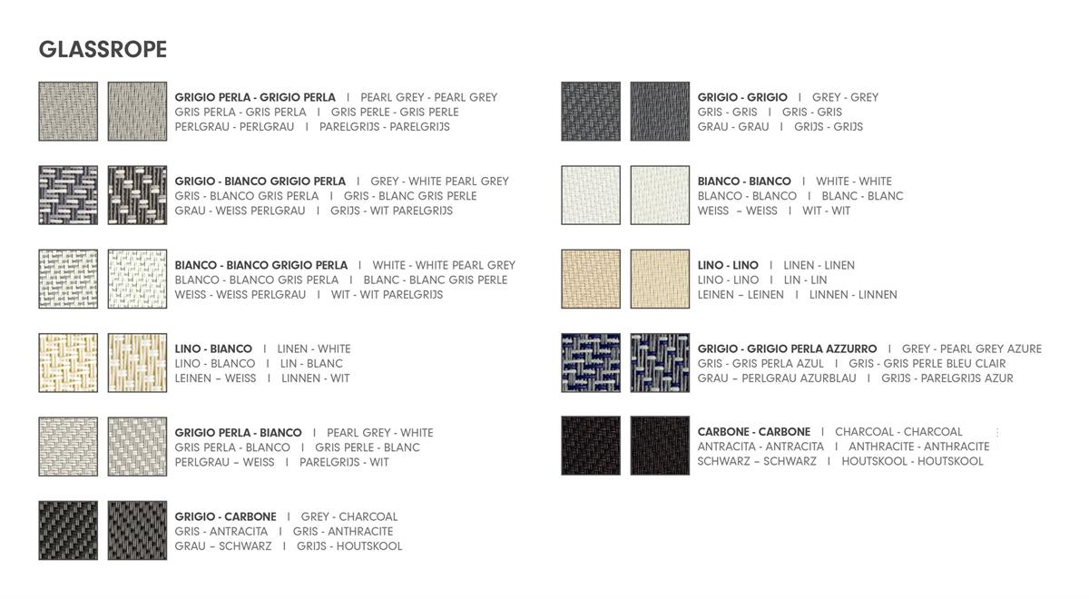Mineral fibre and resin are blended together to give their strength and flexibility to Glassrope, the special fibreglass fabric that raises the Corradi world to an even more advanced level of engineering and design. In fact, its high tensile strength and resistance to tears make this material particularly suitable for aerospace and marine applications. And since innovation has always been part of Corradi's DNA (inventor of the first Pergotenda®, as well as the range of nautically inspired sun sails), from today Glassrope becomes one of the fabric options for Diffusa, in a positive and unique fusion of sky, sea and land.