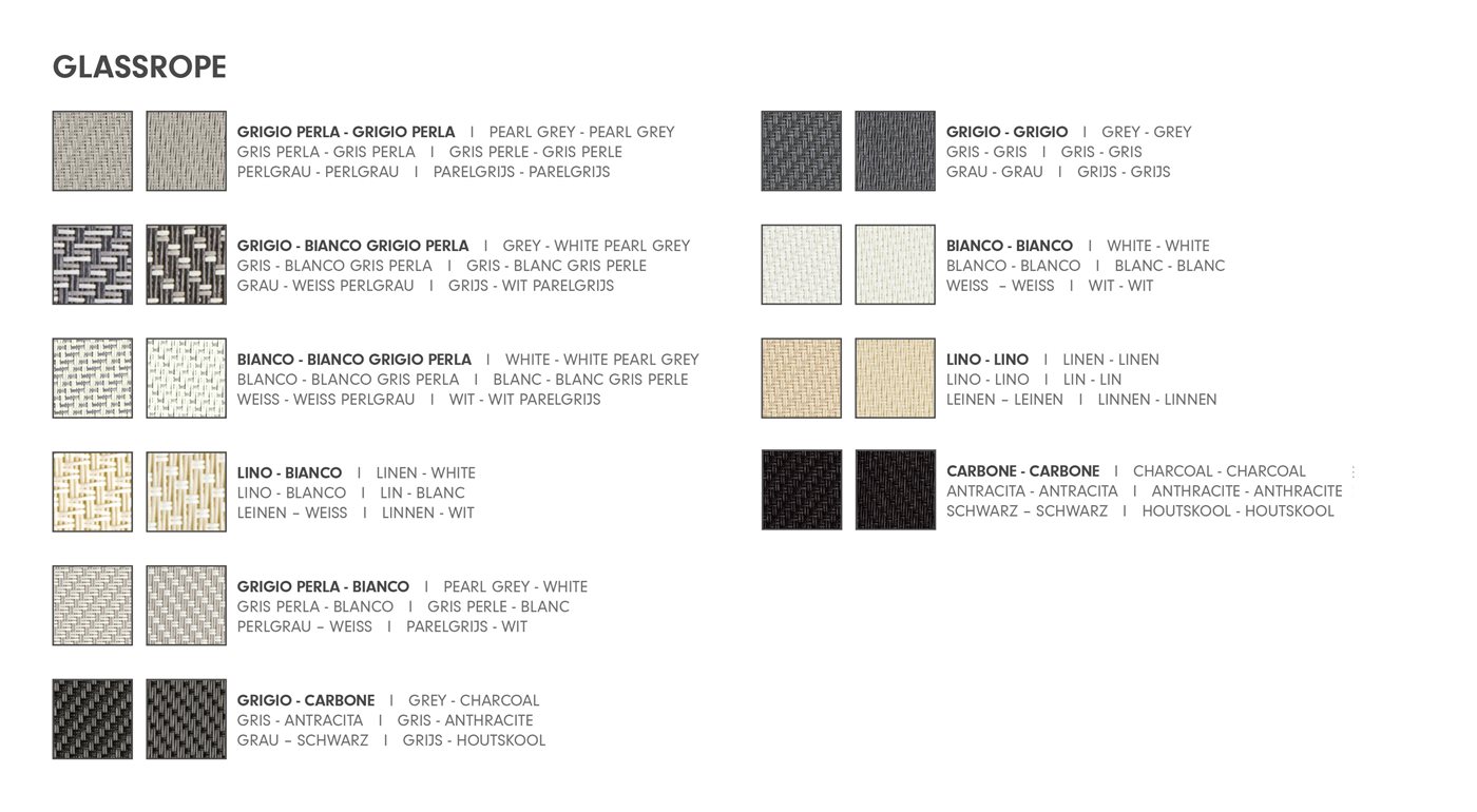 Glassrope mantiene inalterate nel tempo le sue dimensioni e qualità fisiche e appartiene alla più alta classe di resistenza al fuoco: estremamente durevole e pertanto garantito 5 anni, è particolarmente adatto per outdoor dal design intramontabile, firma inconfondibile di Corradi.