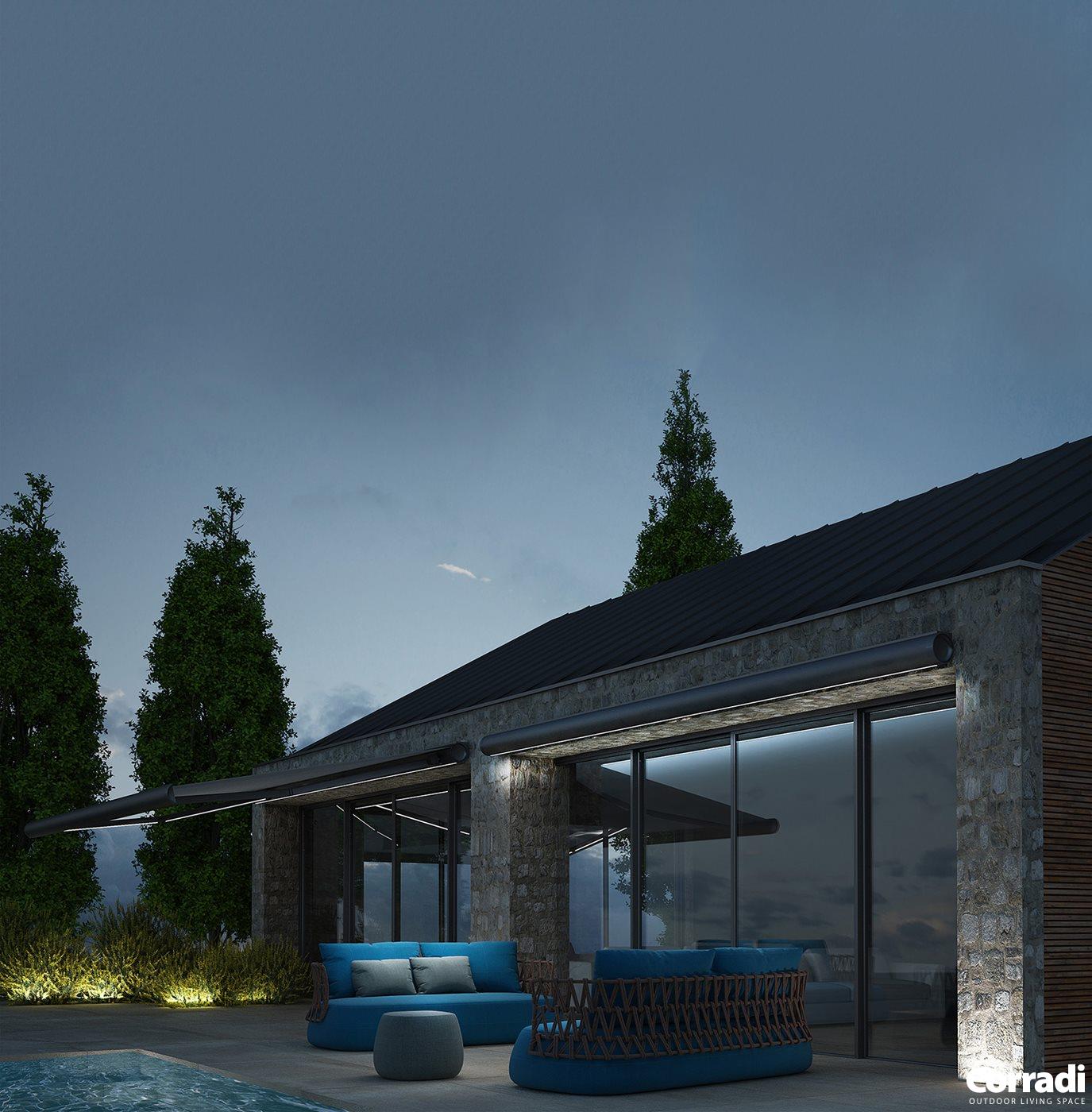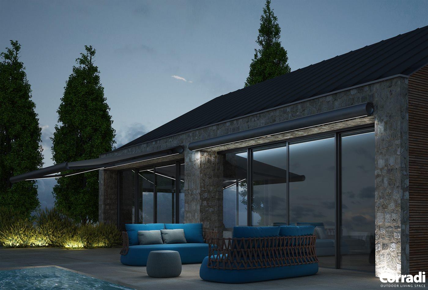 During the day it gives shade; at night it has the option to be illuminated with LED lights, that can be included with the cassette and the arms. Compliments are guaranteed.