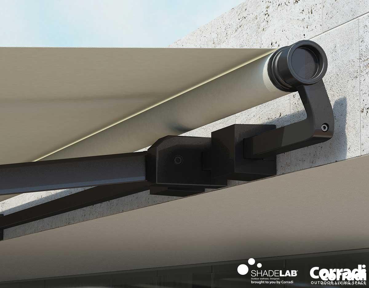 The patented Svet by ShadeLab is a retractable arm awning with an exposed fabric roll and optional hood for extra protection.