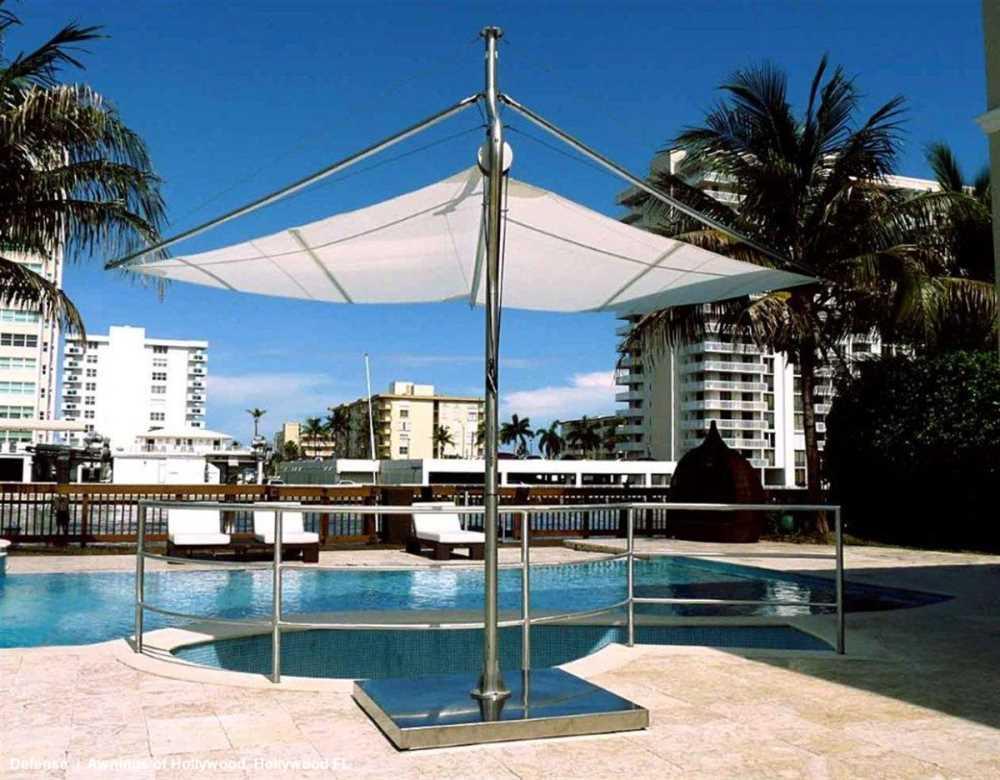 Corradi’s Defense Shade Sail features stainless steel and envelops a horizontal profile with fabric made of UV-protected Dacron® polyester. Its design, comprising of white, triangular sails, creates a square shadow with crisp edges.