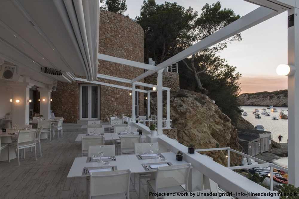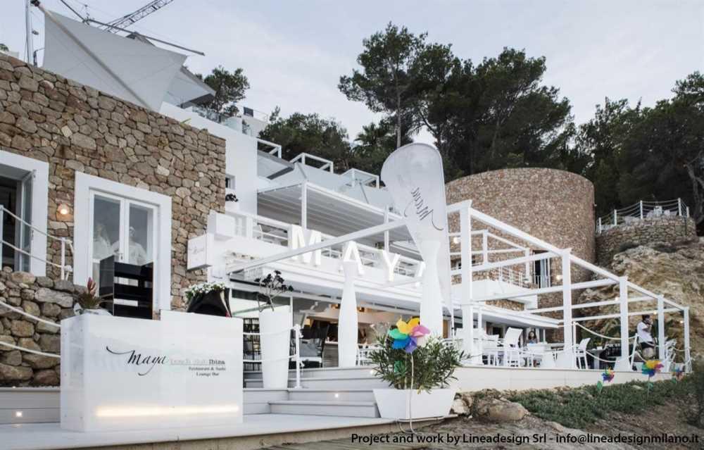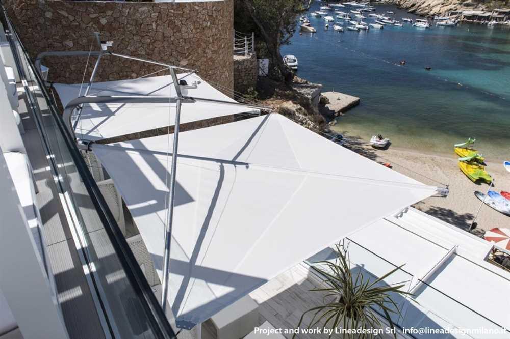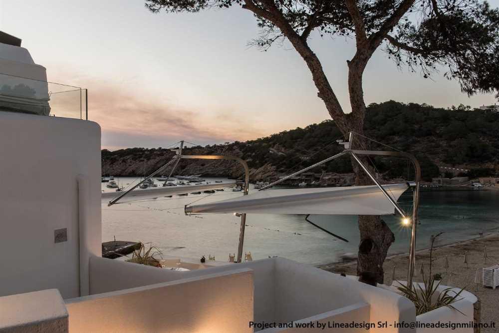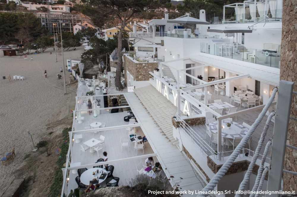 Housed in a typical Mediterranean building made of simple materials and white plaster permeated by a sophisticated mood, the Maya Beach Club has chosen a project by Linea Design to protect its exclusive three-level terrace overlooking the Ibiza sea.