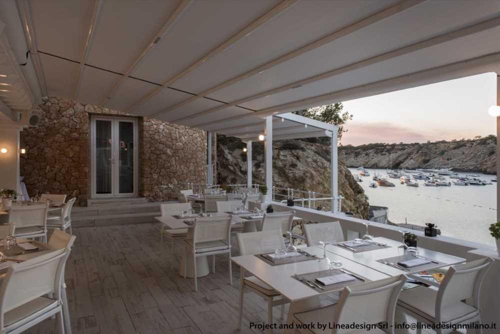 The architecture of the Isla Blanca has as its main feature the ability to blend in perfectly with the surrounding natural environment. The lightness of the Libeccio sails chosen to shade the upper terrace and the essential design of Pergotenda® Palladia at the location's entrance embrace the architecture and amplify the sense of merging with the landscape of one of the most alluring places in Europe.